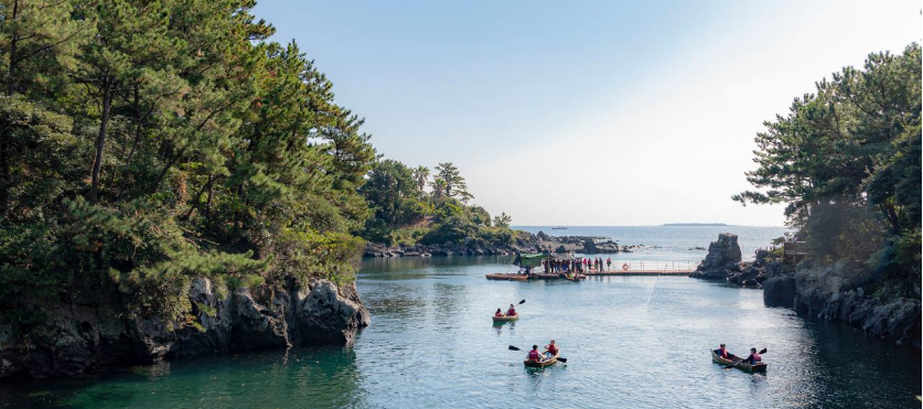 제주에는 산책길도 좋지만, 물 위에서 자연을 즐길 수 있는 경험도 빼놓을 수 없죠! 쇠소깍은 기암괴석과 소나무 숲이 어우러진 독특한 하구 지역으로, 카약을 타고 제주의 봄을 만끽할 수 있어요.