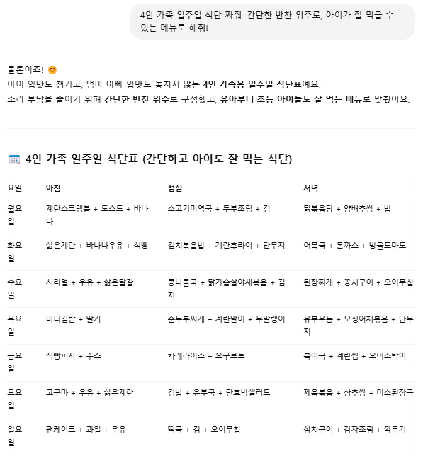 "4인 가족 일주일 식단 짜줘. 간단한 반찬 위주로, 아이가 잘 먹을 수 있는 메뉴로 해줘!"