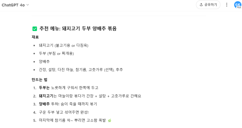 이걸 계기로 ChatGPT는 저의 요리 도우미 1호가 되었답니다.